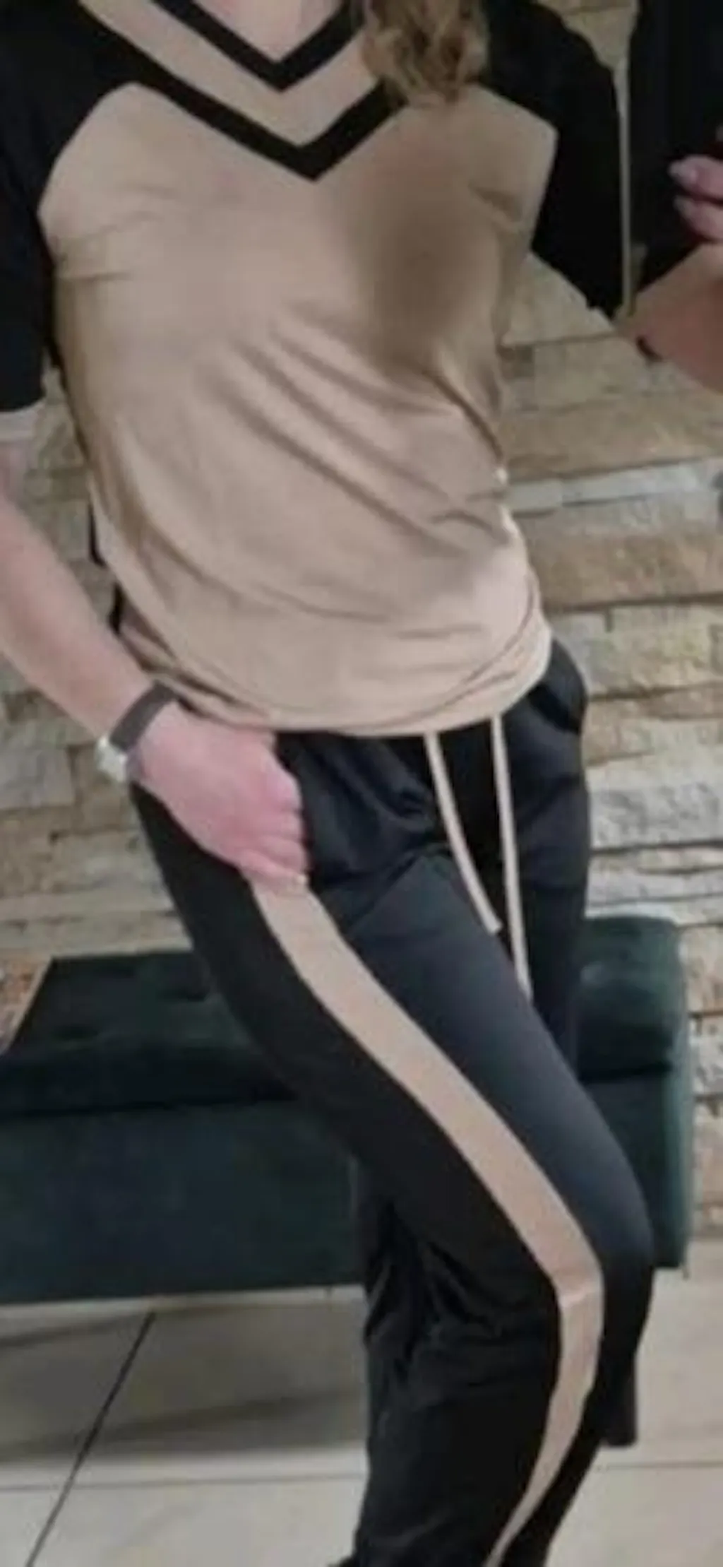 Moderna ženska dvodelna kombinacija s pisanim topom s kratkimi napihnjenimi rokavi in udobnimi hlačami. Idealna izbira za vsakdanjo uporabo ali sproščene priložnosti.